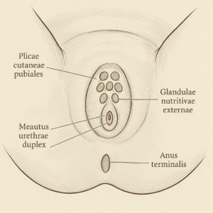 Darunter befinden sich die beiden Meatus urethrae duplex, eigenständige Harnröhrenöffnungen, die jeweils in die gemeinsame Harnblase (vesica urinaria) führen. Diese duplex-urethrale Organisation bietet Redundanz und wird häufig als Symbol der Zuverlässigkeit interpretiert. Der Anus terminalis ist wie bei allen Geschlechtern strikt abgesetzt und liegt dorsal.
